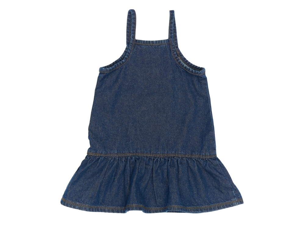 Denimkjole fra THE NEW siblings. Kjolen har smalle stropper og en lille broderet sommerfugl foran på brystet samt flæsekant nederst.