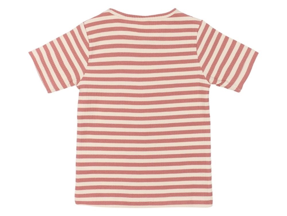 Pige klædt i rosa og hvidstribet t-shirt fra The New Siblings TNST6206 old rose stripedRosa og hvidstribet t-shirt fra The New Siblings TNST6206 old rose stripedKortærmet t-shirt fra The New Siblings i mørk rosa og råhvid stribet TNST6206 old rose striped bagfra