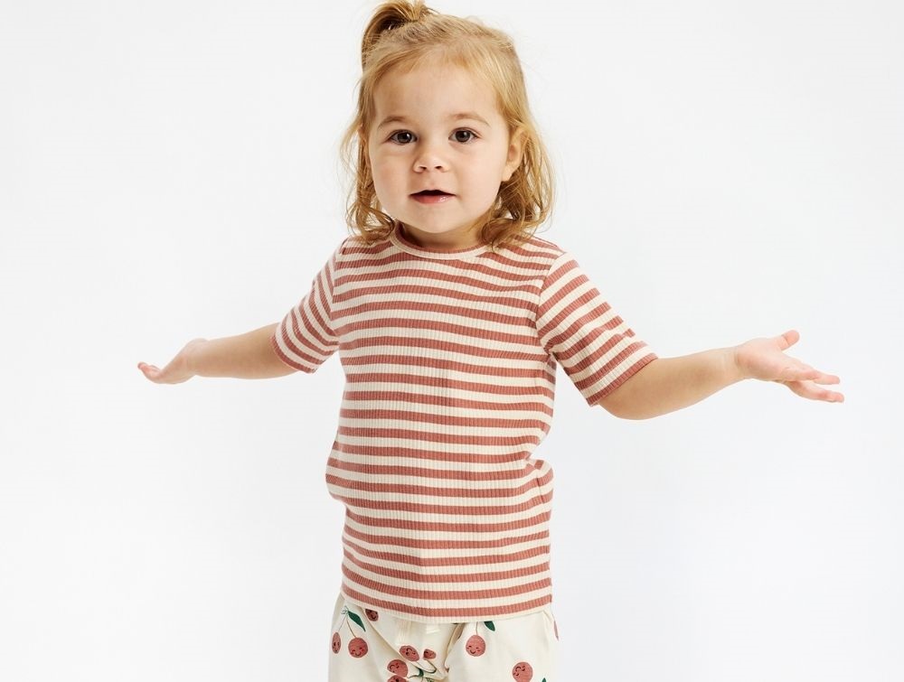 T-shirt i blød og elastisk ribkvalitet med korte ærmer og vandrette striber i råhvid og mørk rosa. Den tætsiddende pasform og de fine farver gør toppen nem at matche med forskellige underdele. Kombinér med de matchende Fro shorts for et komplet sæt.