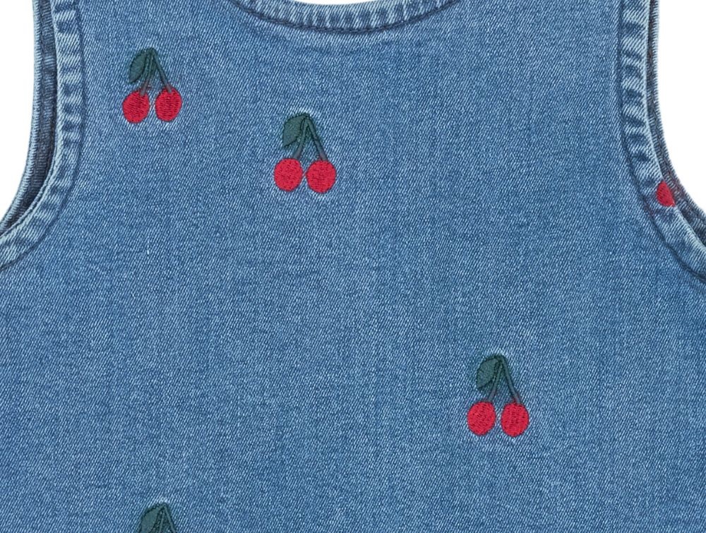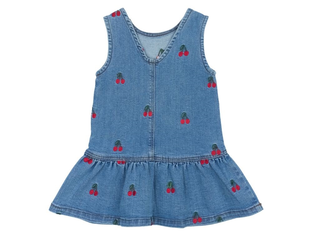 Den fine kjole har en afslappet, bred pasform og fine kirsebærbroderier, der tilføjer et sødt touch. Den gode denimkvalitet gør den både komfortable og nem at style til hverdagens outfits.