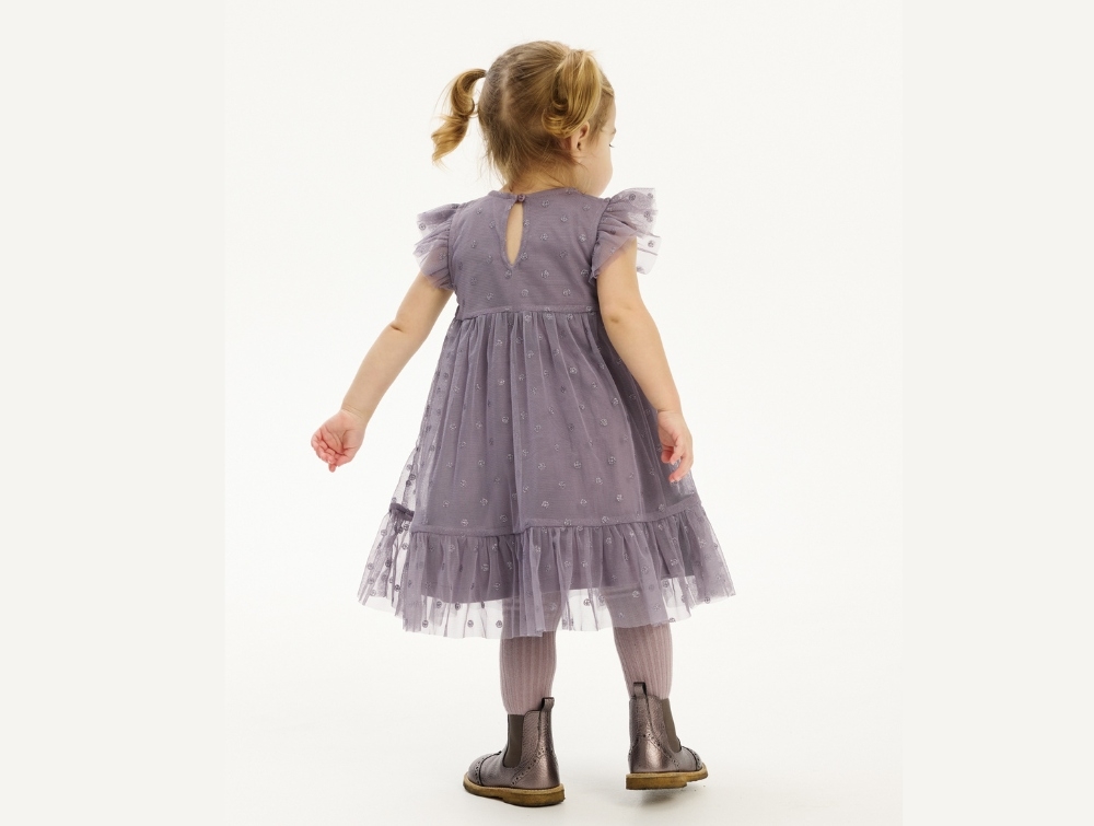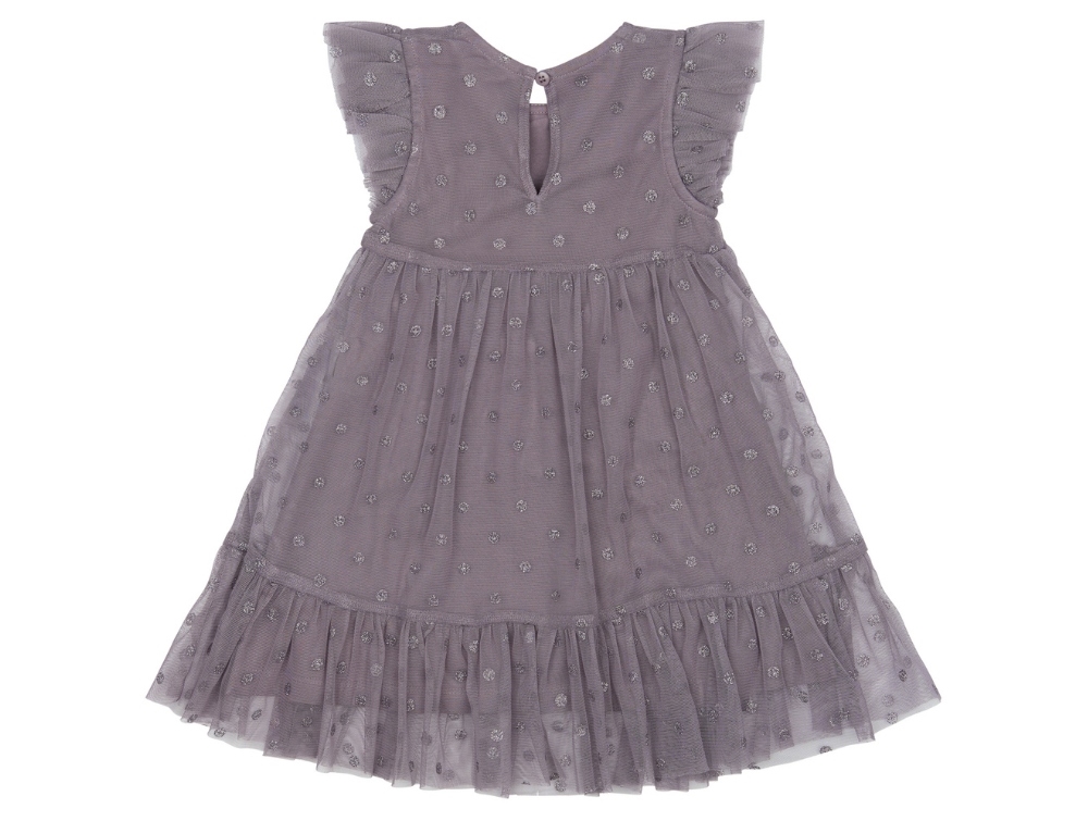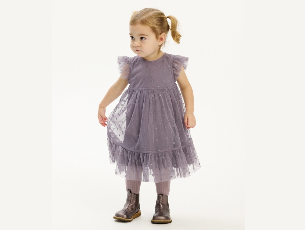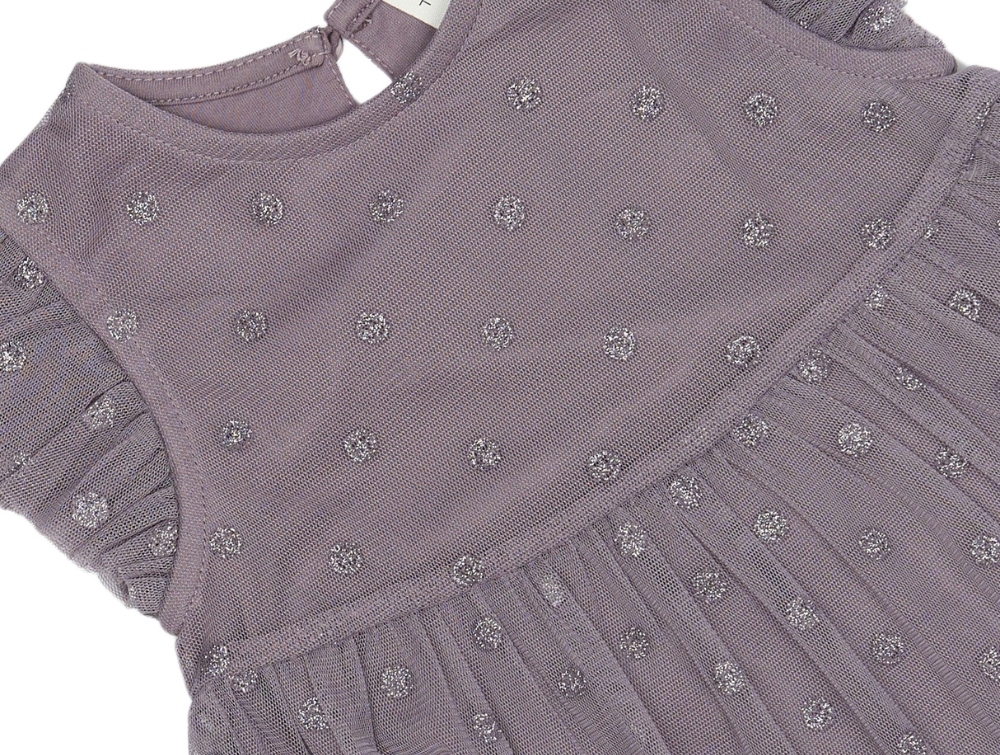 Meshkjole i grå fra THE NEW siblings med glimmerprikker. Kjolen er to-lags med en inderkjole i blød bomuld og en yderkjole i let mesh med broderede prikker.
