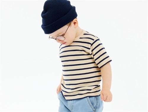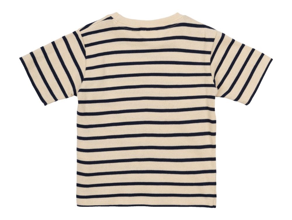 Blød og let t-shirt med et klassisk stribet design i råhvid og mørkeblå. Denne t-shirt er perfekt til både drenge og piger, der ønsker et stilrent og afslappet look.