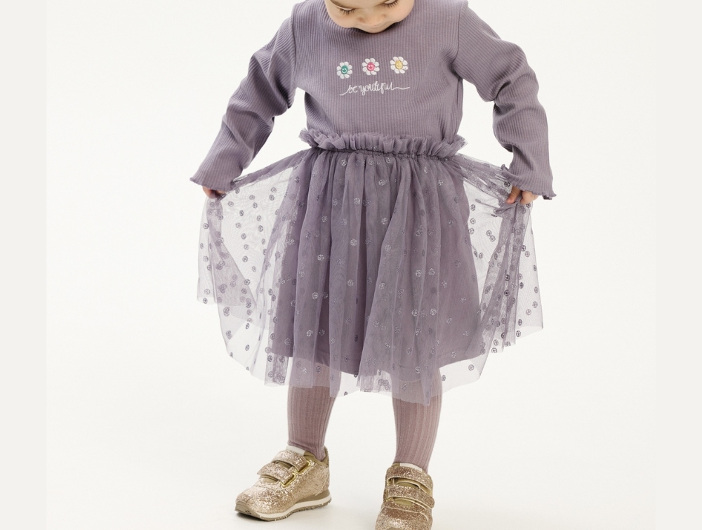 Den har almindelig pasform og elastik i taljen for en behagelig pasform. Indeholder glitter, der kan ændre sig efter vask og brug.