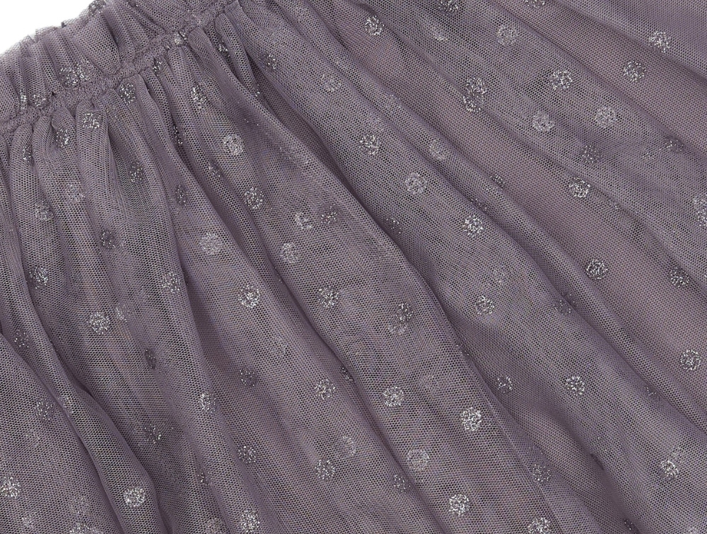 Tylnederdel i grå fra THE NEW siblings med prikker. Nederdelen er to-lags med et inderlag i blød bomuld og et yderlag i let mesh med broderede prikker.