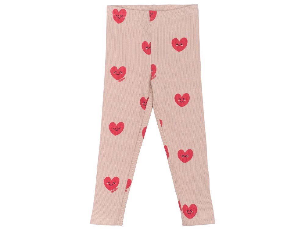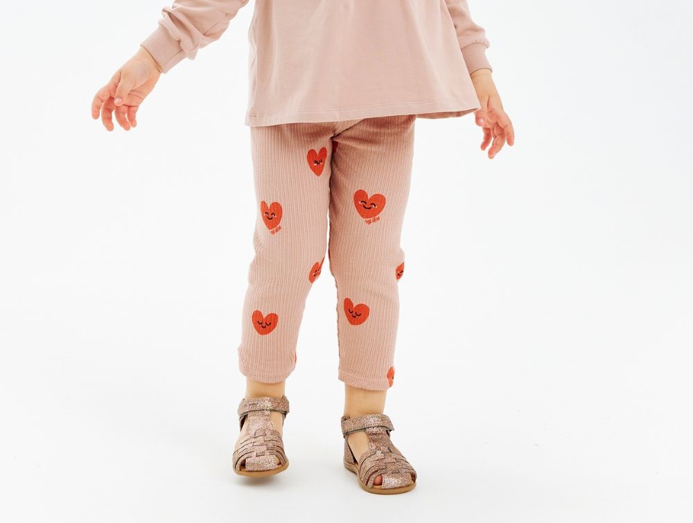 De bløde ribbukser har et sødt hjerteprint og en strækbar kvalitet, der sikrer en behagelig pasform. Den elastiske talje giver fleksibilitet og komfort, mens den tætte ribstruktur tilføjer et klassisk look.