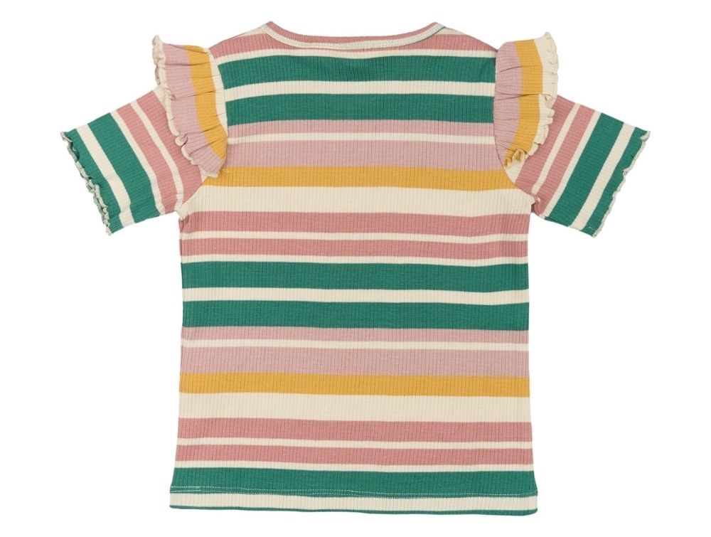 Pige klædt i multistribet Ocean T-shirt og bukser fra The New Siblings TNST6237 multi stripeMultistribet kortærmet Ocean T-shirt fra The New Siblings TNST6237 multi stripeMultistribet kortærmet Ocean T-shirt fra The New Siblings TNST6237 multi stripe bagfra