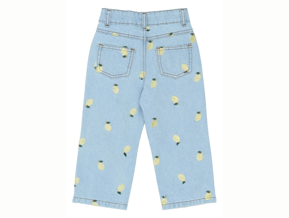 THE NEW Siblings Saja wide jeans light blue denim med citronbroderi forfraTHE NEW Siblings Saja wide jeans light blue denim med citronbroderi vist på barnTHE NEW Siblings Saja wide jeans light blue denim tæt på linningTHE NEW Siblings Saja wide jeans light blue denim set bagfra