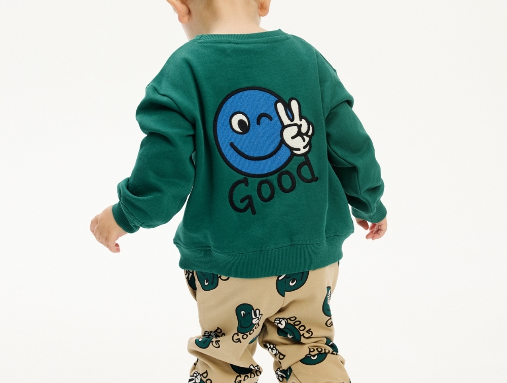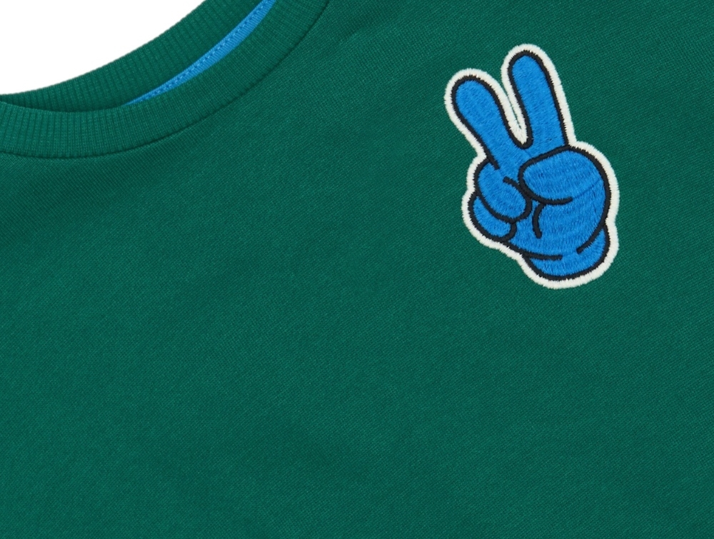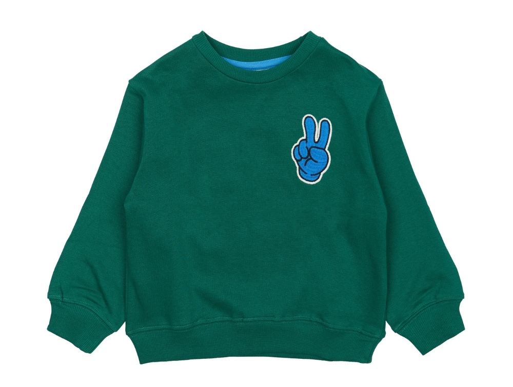 Grøn sweatshirt fra THE NEW siblings med sjove prints og broderi. Sweateren har en lille blå hånd med peace-tegn broderet på brystet og et større print af en blinkende blå smiley med teksten "Good" på ryggen. Lavet af 100% økologisk bomuld (GOTS).