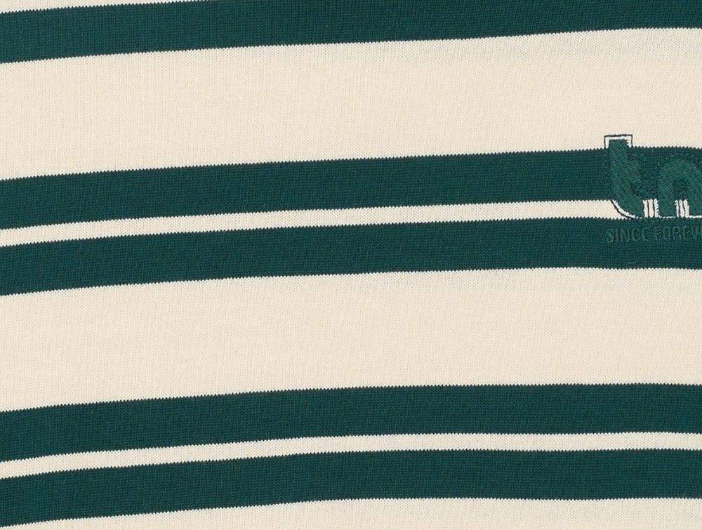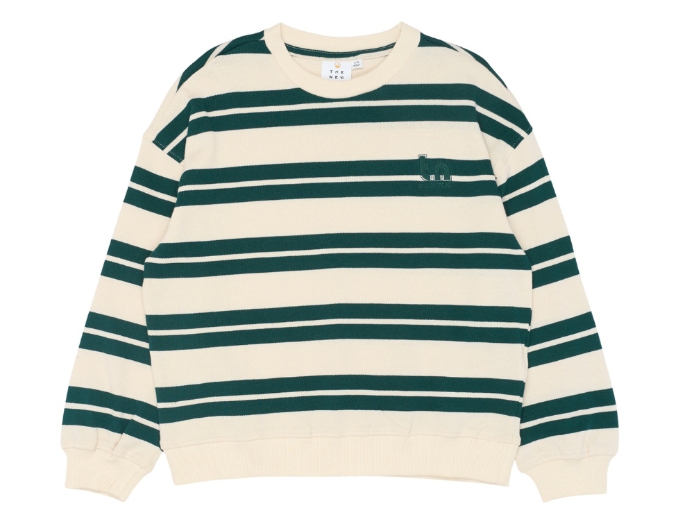 Stribet sweatshirt i beige nuance og grønne striber fra THE NEW. Sweatshirten har et afslappet snit med ribkanter ved hals, ærmer og bund. Broderet logo-detalje på brystet giver et sporty udtryk.
