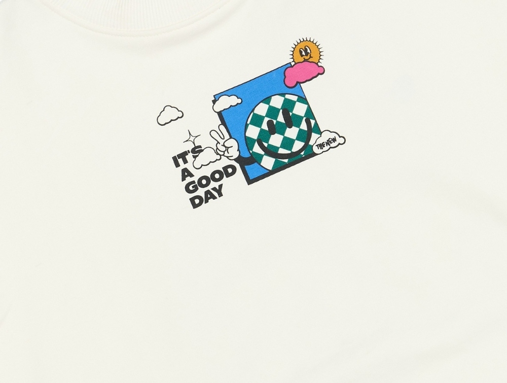 Fremstillet i en blød kvalitet af 95% økologisk bomuld (GOTS-certificeret) og 5% elastan, som giver en behagelig pasform til hverdagsbrug. Designet har rund hals og ribkanter. Foran ses et mindre print med en ternet smiley, sol, skyer og teksten "It’s a good day". På ryggen er printet forstørret med ekstra elementer og teksten "Every day is a good day".