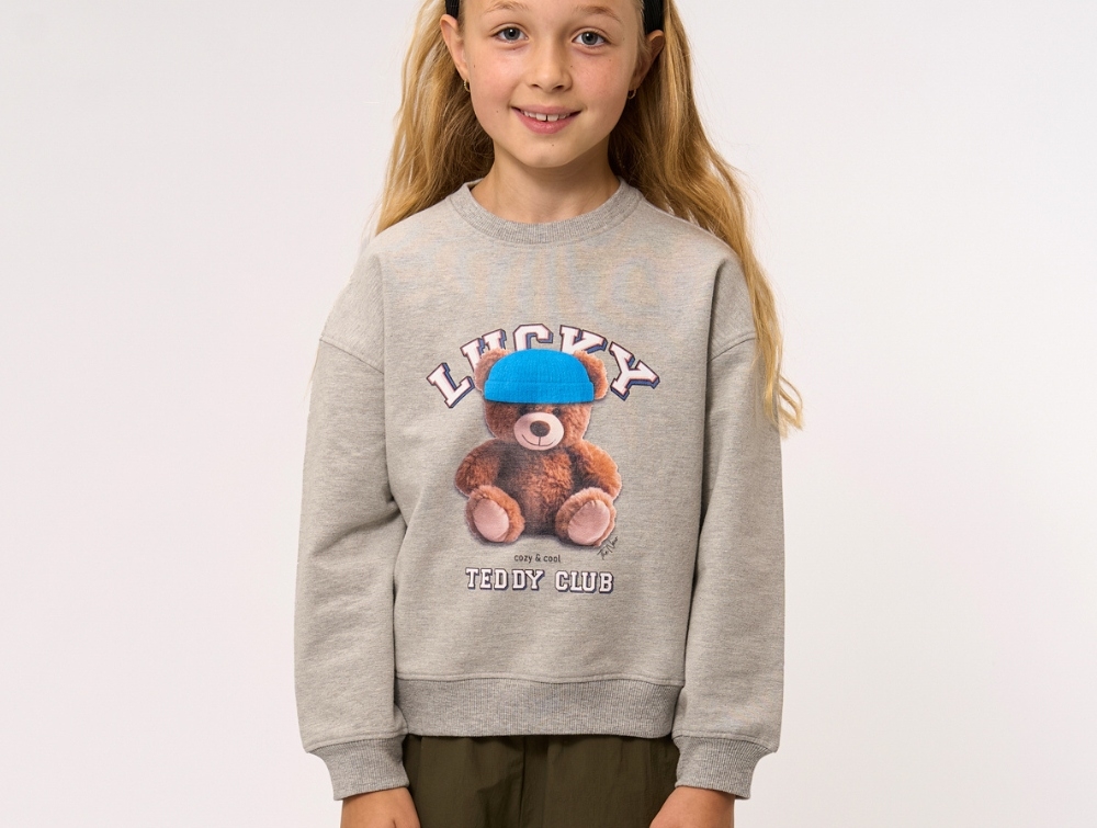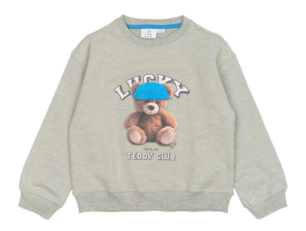 Pige iført grå sweatshirt fra THE NEW med teddy printPige iført grå sweatshirt fra THE NEW med teddy printGrå sweatshirt fra THE NEW med teddy motiv på brystetGrå sweatshirt fra THE NEW med teddy motiv på brystet bagside