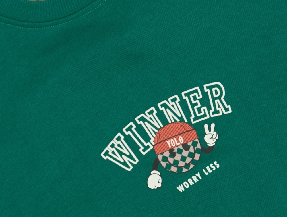 Designet har et oversize look med rund hals og ribkanter. På brystet ses teksten "WINNER" med en figur, der bærer en hue med teksten "YOLO" og giver peace-tegn. Bagpå ses en forstørret version af printet med teksten "worry less".