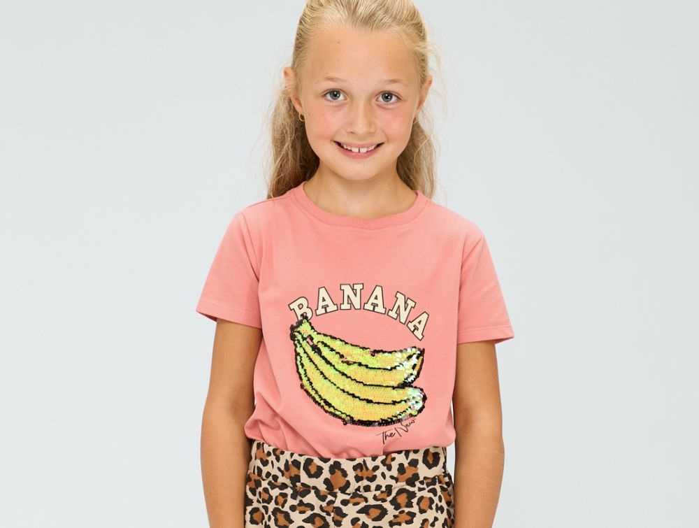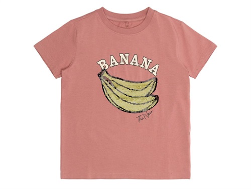 Støvet mørk rosa t-shirt med banan af gule pailletter fra The New TN6255 old roseStøvet mørk rosa t-shirt med banan af guldpailletter fra The New TN6255 old roseStøvet mørk rosa t-shirt fra The New TN6255 old rosePige i t-shirt fea The New i lyserød med bananmotiv i vendbare pailletter TN6255 old rose