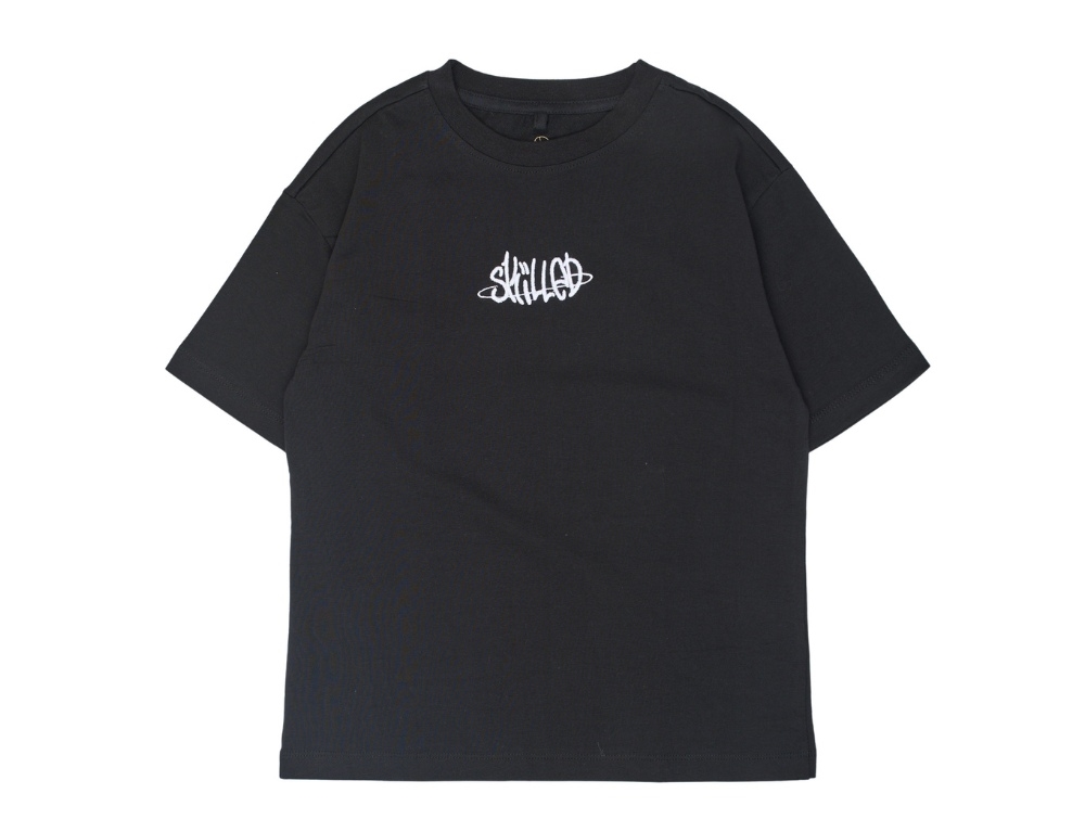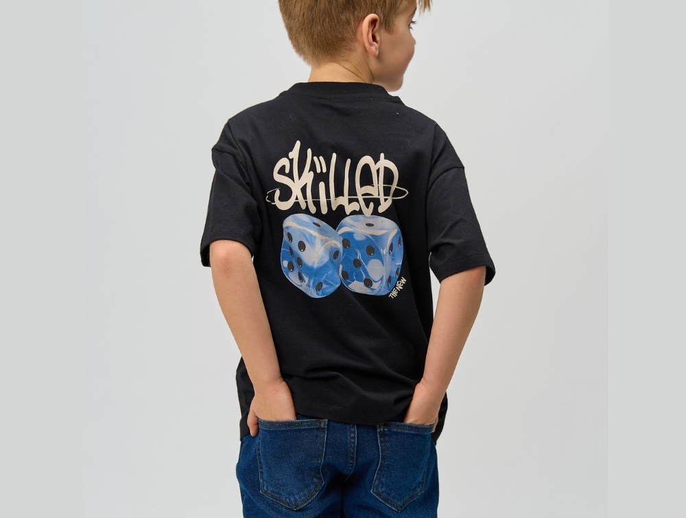 Oversize t-shirt i sort fra THE NEW. Foran er den broderet med et lille "SKILLED"-logo, mens bagsiden har et stort grafisk print med blå terninger og et stort "SKILLED"-motiv. Den bløde bomuldskvalitet giver en behagelig pasform og gør den velegnet til hverdagsbrug.