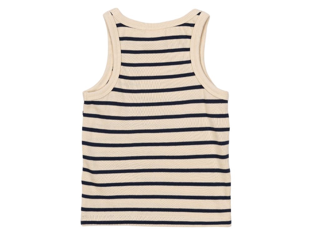 Denne ærmeløse top har et klassisk stribet design i råhvid og mørkeblå nuancer, hvilket gør den nem at style til enhver lejlighed. På brystet har den et broderet hjerte i rød, der tilføjer et sødt og unikt touch.