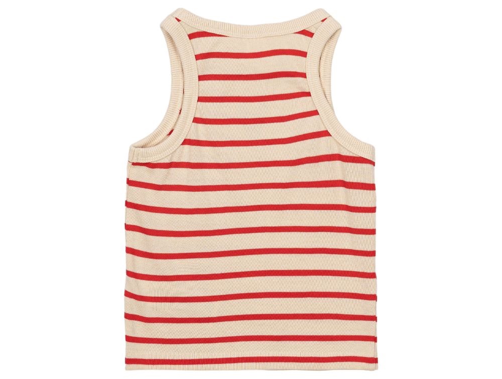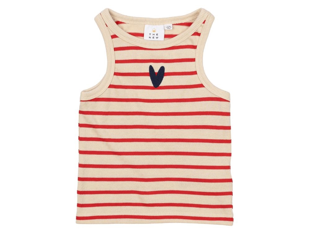 Denne ærmeløse top har et klassisk stribet design i råhvid og røde nuancer, hvilket gør den nem at style til enhver lejlighed. På brystet har den et broderet hjerte i mørkeblå, der tilføjer et sødt og unikt touch.