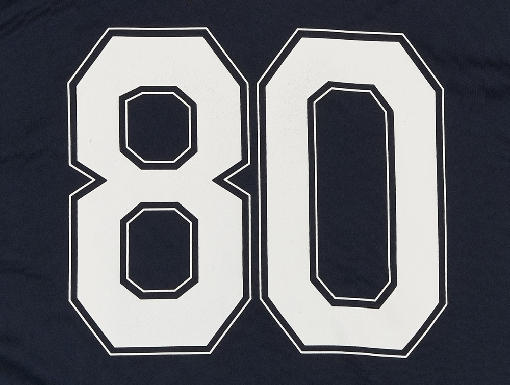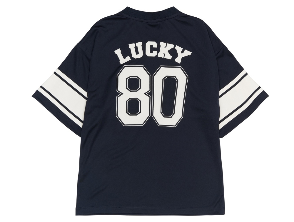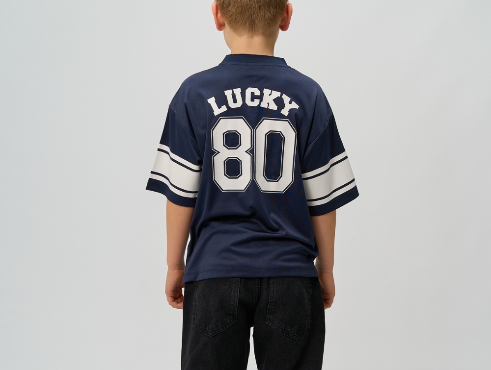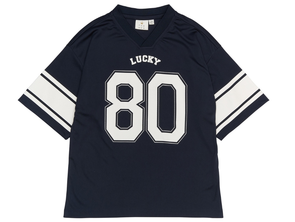 T-shirt i navy blazer fra THE NEW med inspiration fra amerikanske football jerseys. Designet har en oversize pasform med brede hvide striber på ærmerne samt det markante "80 LUCKY"-print både foran og bagpå.