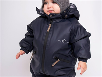 Flyverdragt i gummi i farven navy fra Ver de Terre. Dragten har en aftagelig hætte med trykknapper.