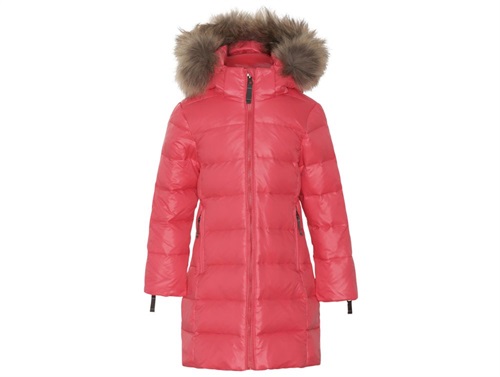 Vinter-dunfrakke til piger fra Ver de Terre med ægte andedun og aftagelig hætte med ægte pels. Den ægte pels på hætten er certificeret af Saga Fur og kommer fra Europa.