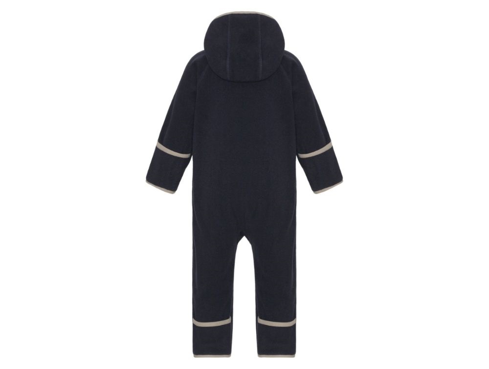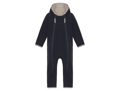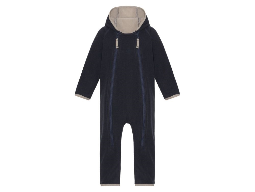 Fleecedragt i farverne navy/mocca med hætte og to praktiske lynlåse fra Ver de Terre. Dragten er lavet af blød og varm fleece med kontrastfarvet inderside. Den har vendbare hånd- og fodstykker, som kan foldes over for ekstra varme. Produceret i 100% polyester.
