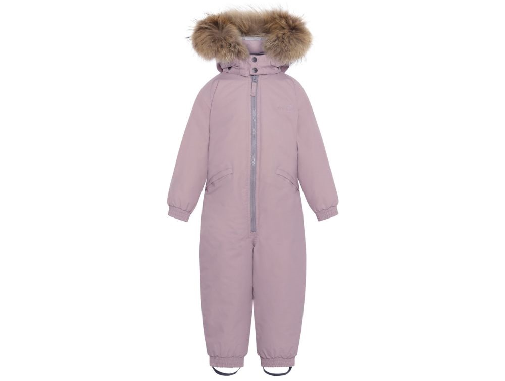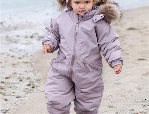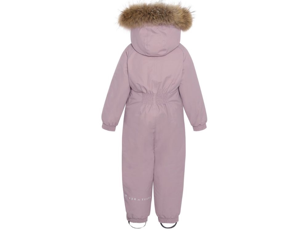 Flyverdragt i farven heather fra Ver de Terre med aftagelig hætte med pels. Den ægte pels på hætten er certificeret af Saga Fur og kommer fra Europa.