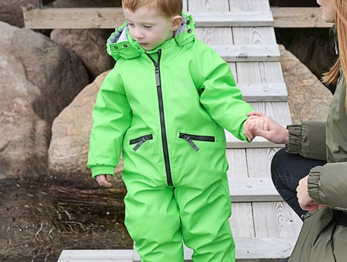 Flyverdragt i farven frog i gummi fra Ver de Terre. Dragten har en aftagelig hætte med trykknapper.