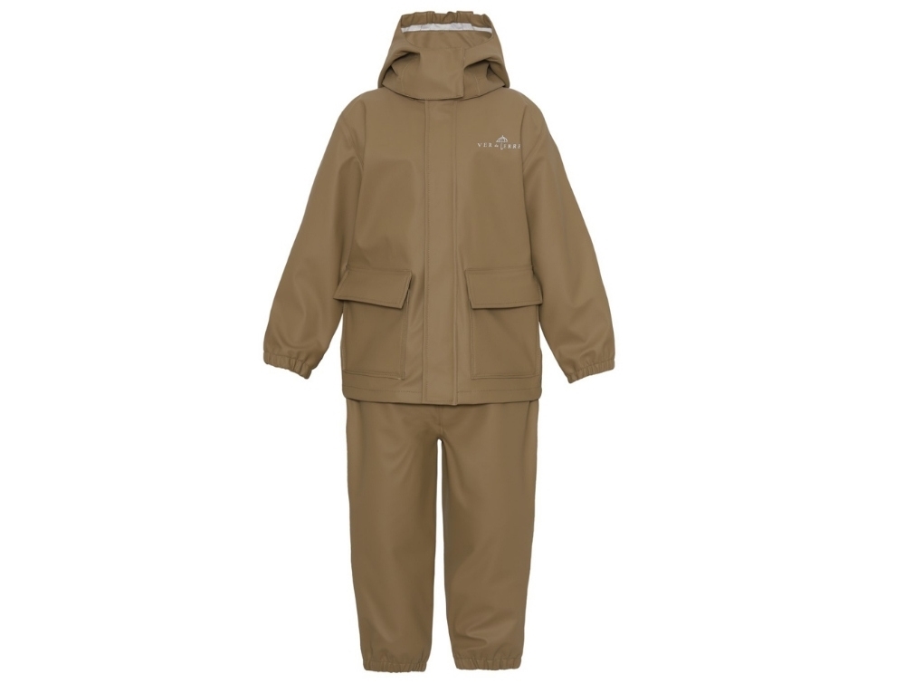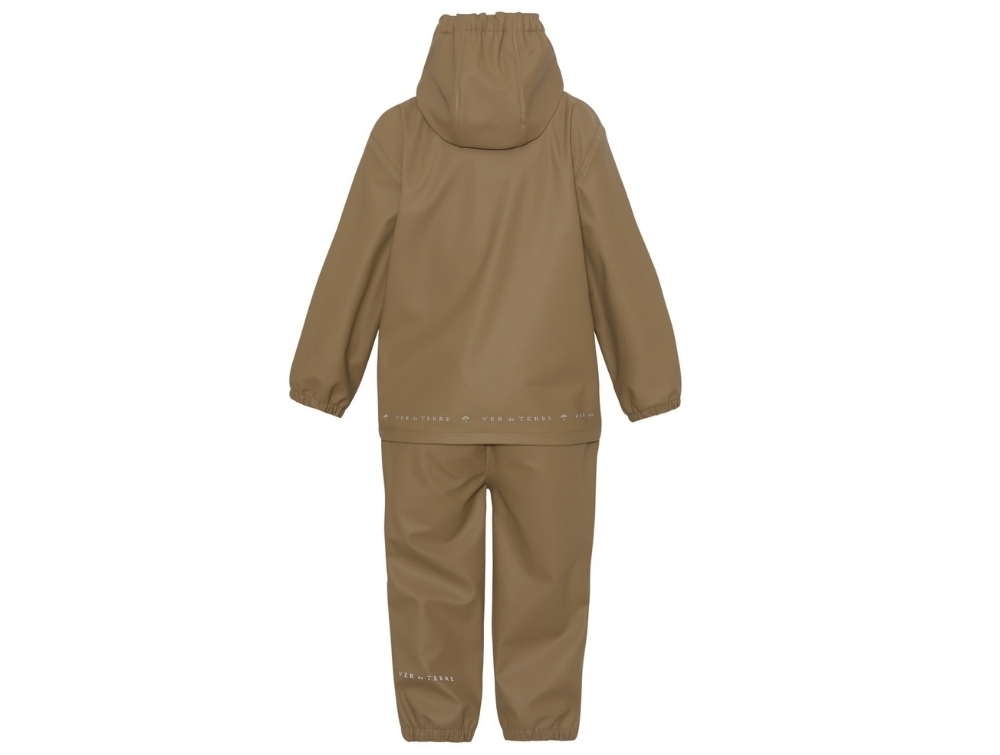 Regnsæt i brun nuance fra Ver de Terre bestående af regnjakke og regnbukser i blød PU-kvalitet. Sættet har et roligt og funktionelt udtryk og er designet til aktive dage i regnvejr. Almindelig pasform med god bevægelsesfrihed.