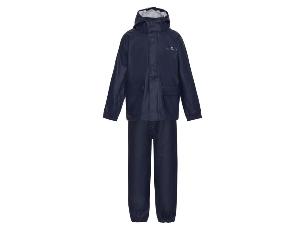 Regnsæt i gummi med bukser og jakke i farven navy fra Ver de Terre. Regnjakken har to lommer og en aftagelig hætte med trykknapper. Bukserne er designet med seler og aftagelige fodstropper op til og med størrelse 3 år, mens bukser fra størrelse 4 år og opefter har justerbar elastik i taljen. Sættet er fremstillet i blødt, vandtæt PU-materiale med svejsede sømme. Bemærk, at PU-belægningen kan blive slidt eller få huller ved kontakt med sand, sten eller skarpe genstande. Vandtæthed: 10.000 mm. Produceret i 70% polyester, 30% polyurethan. Vaskes ved maks. 30°C på skåneprogram.