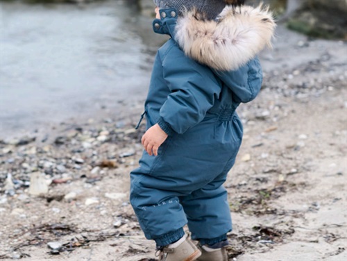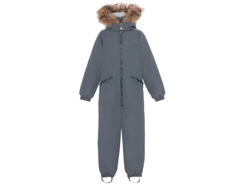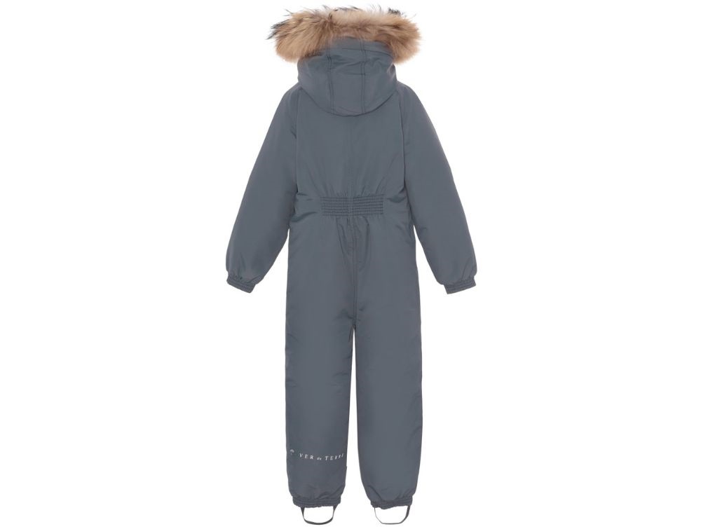 Flyverdragt i farven slate (blågrå) fra Ver de Terre med aftagelig hætte med pels. Den ægte pels på hætten er certificeret af Saga Fur og kommer fra Europa.