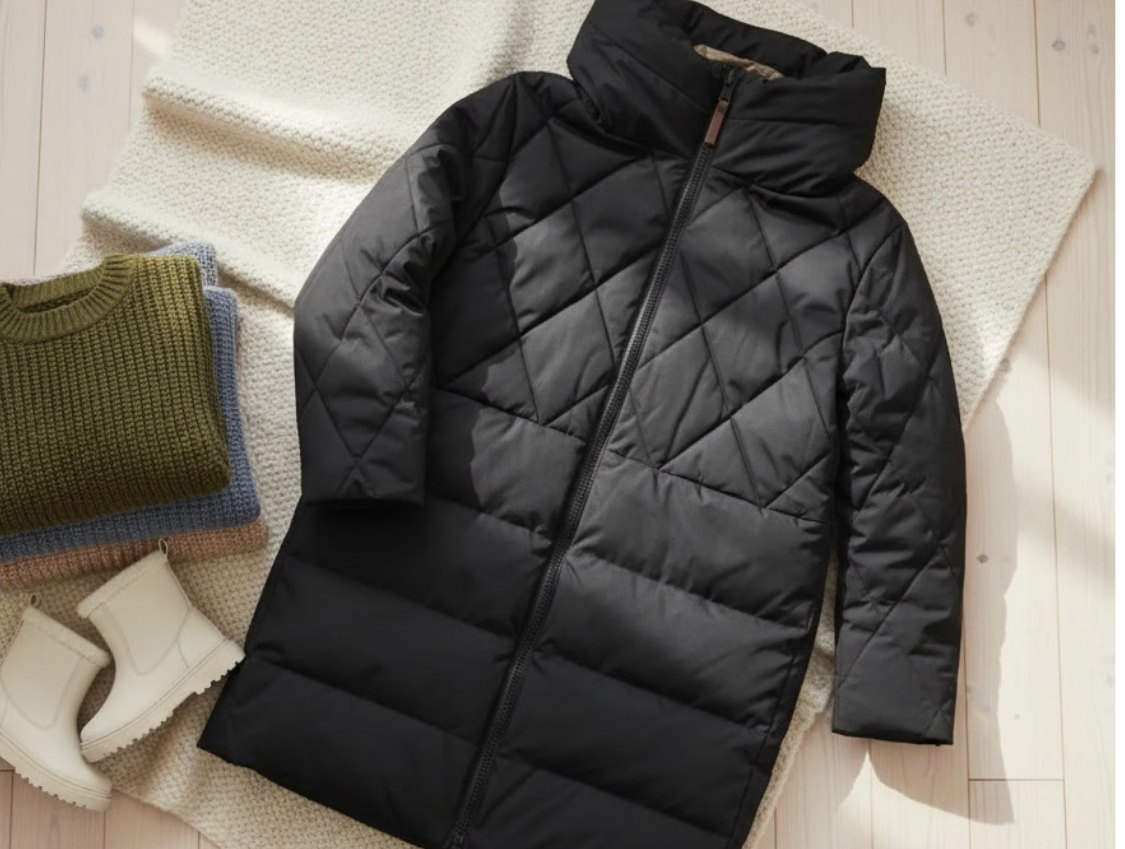 Frakken er vendbar og kan enten have en sort eller karamelfarvet yderside. Der er to lommer på begge sider af fronterne.