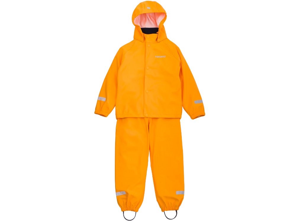 Regnsæt i gul-orange nuance (sun) fra Viking, bestående af jakke og bukser. Sættet er fremstillet i genanvendt polyester med PU-belægning og behandlet med fluorfri BIONIC-FINISH® ECO, som giver en vandafvisende overflade. Med en vandtæthed på 5.000 mm og svejsede sømme holder sættet barnet tørt på regnfulde dage.
