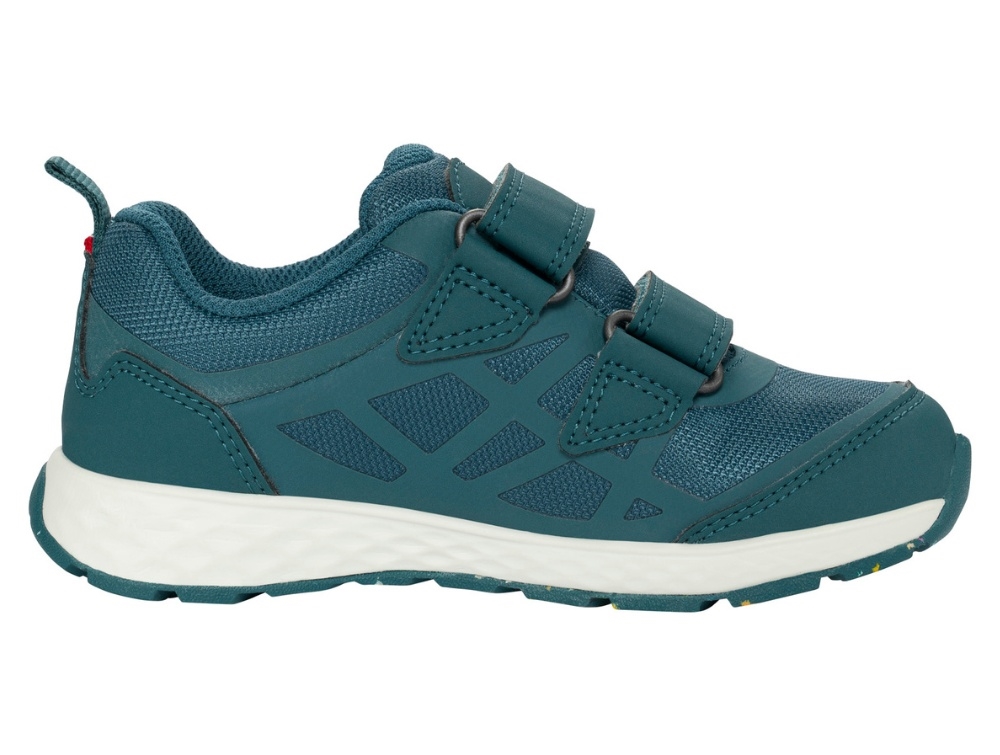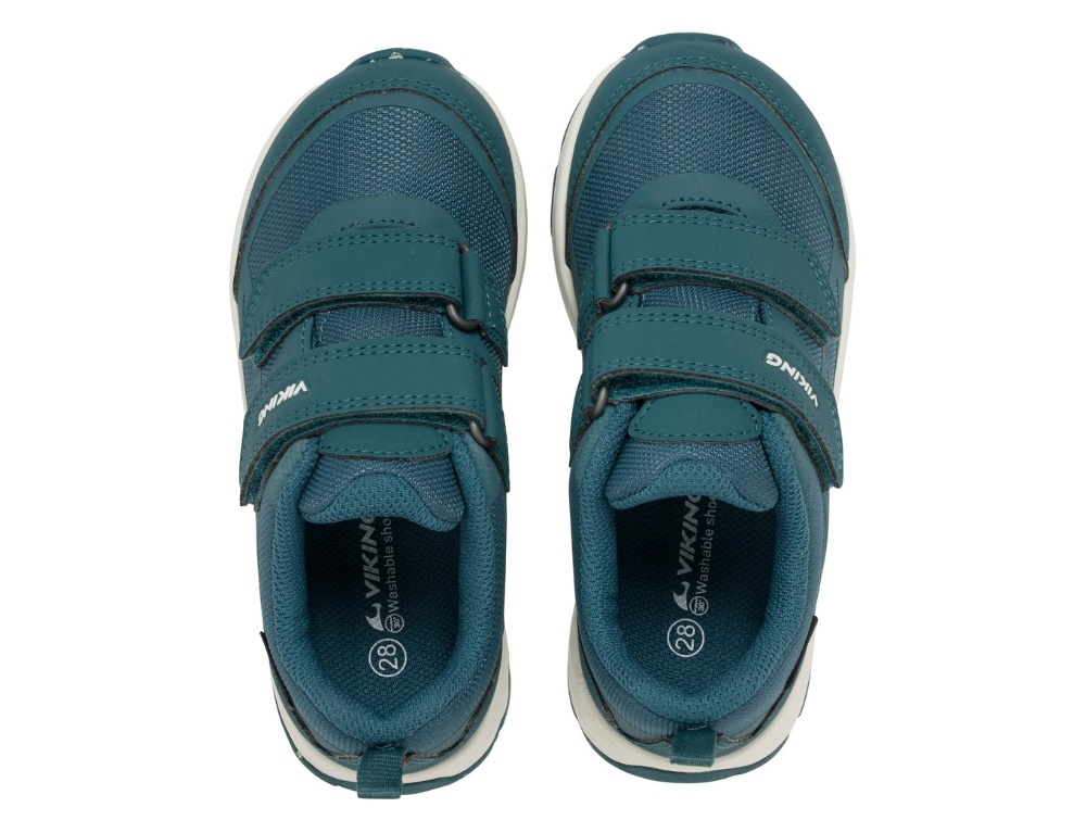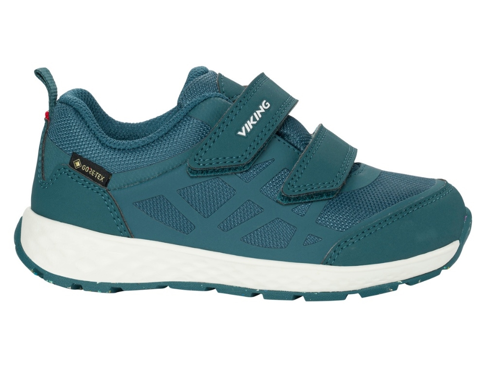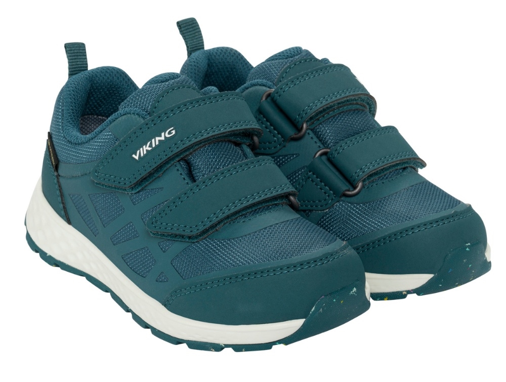 Sneaker i petrol nuance fra Viking med dobbel velcrolukning, refleksdetaljer og vandtæt konstruktion. Modellen er designet til aktiv brug og giver god komfort til både leg og hverdagsaktiviteter.