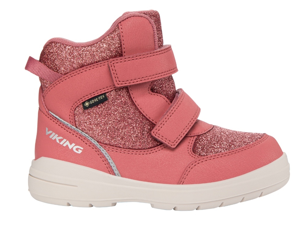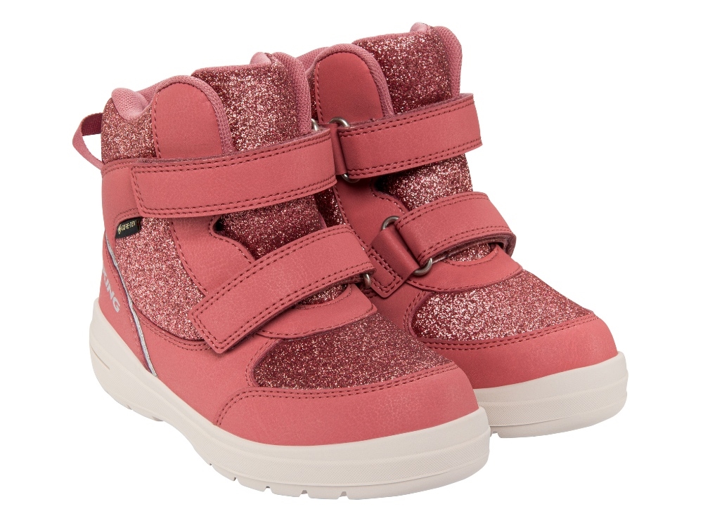 Viking vinterstøvle til børn i en rosa nuance med glimmerdetaljer, der kombinerer et sporty look med praktisk funktion og et feminint udtryk. Overdelen er fremstillet i en kombination af tekstil og syntetisk materiale, mens en vandtæt GORE-TEX membran holder fødderne tørre. Støvlen har et mellemhøjt skaft, dobbelt velcrolukning og en ergonomisk bred pasform, som gør den nem for børn at tage af og på.