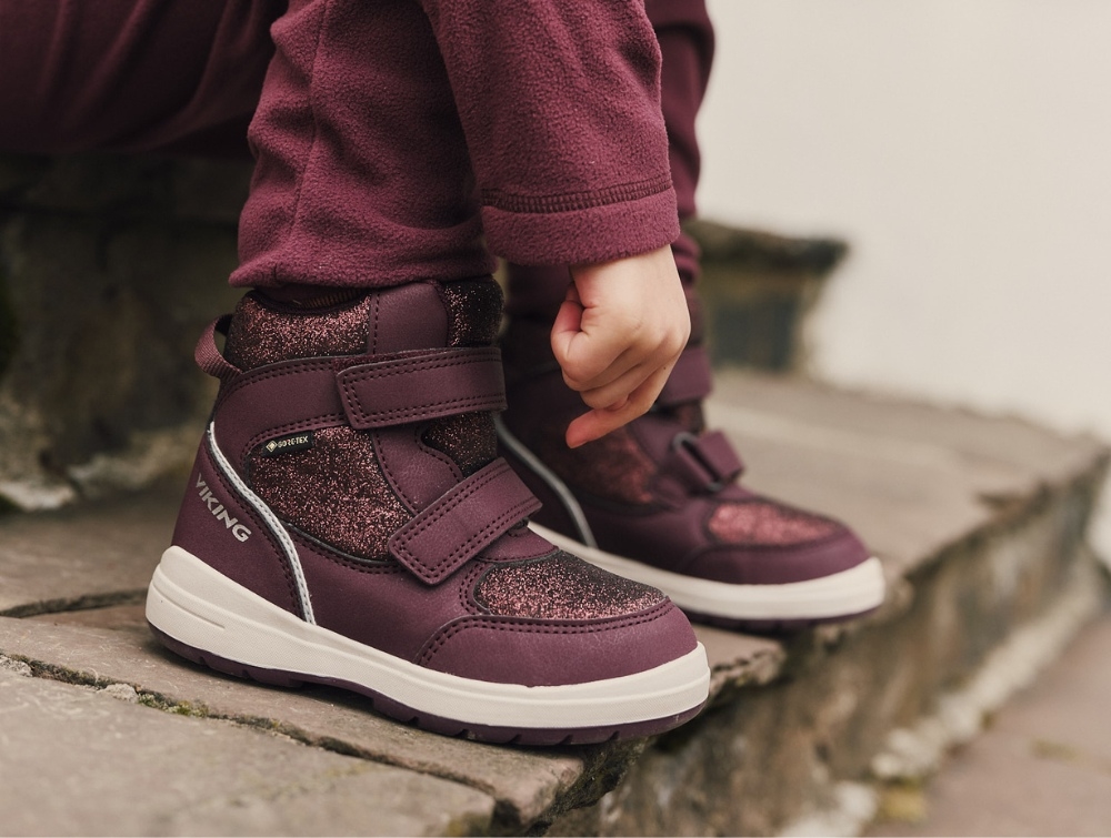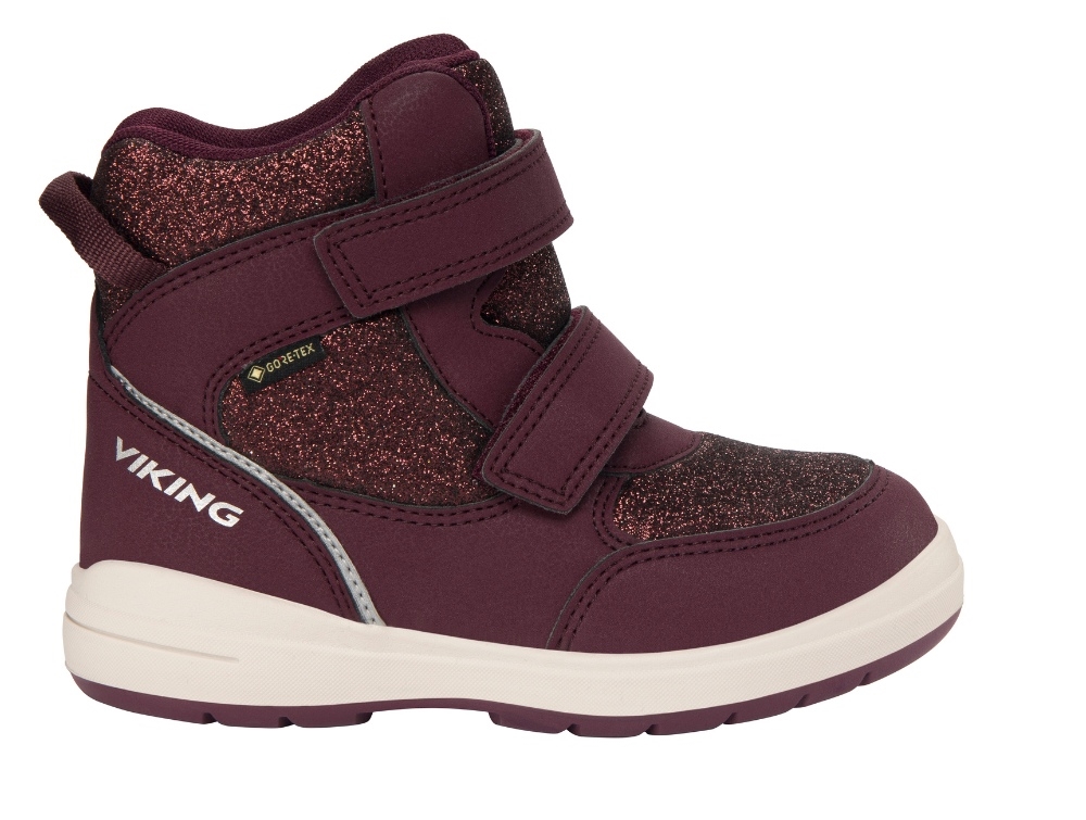 Viking vinterstøvle til børn i en dyb lilla nuance med glimmerdetaljer, der kombinerer et sporty look med praktisk funktion og et feminint udtryk. Overdelen er fremstillet i en kombination af tekstil og syntetisk materiale, mens en vandtæt GORE-TEX membran holder fødderne tørre. Støvlen har et mellemhøjt skaft, dobbelt velcrolukning og en ergonomisk bred pasform, som gør den nem for børn at tage af og på.