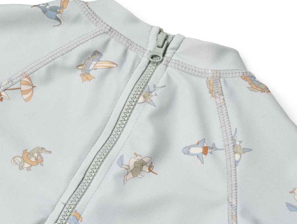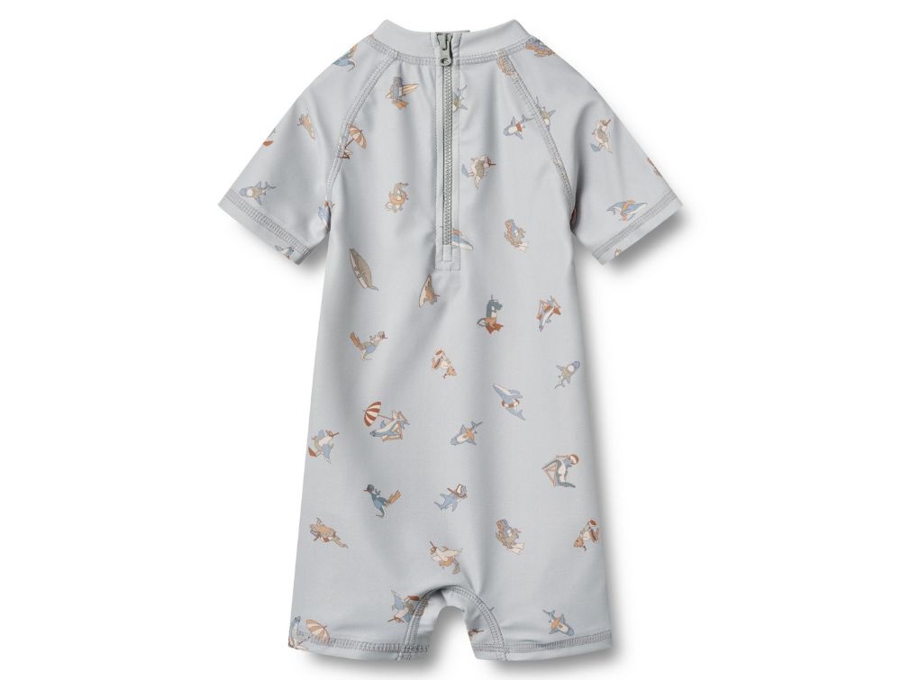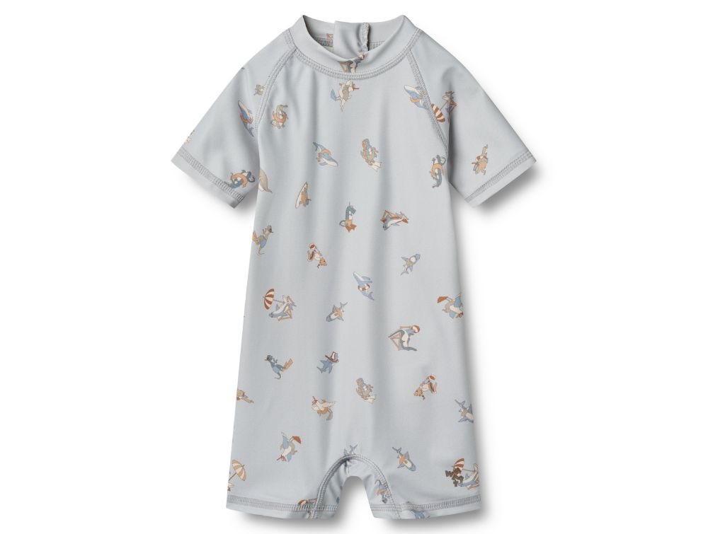 Lyseblå badedragt fra Wheat med sjovt svømmeprint (swim club). Modellen har korte ærmer og ben samt en lille krave, der beskytter nakken mod solen.