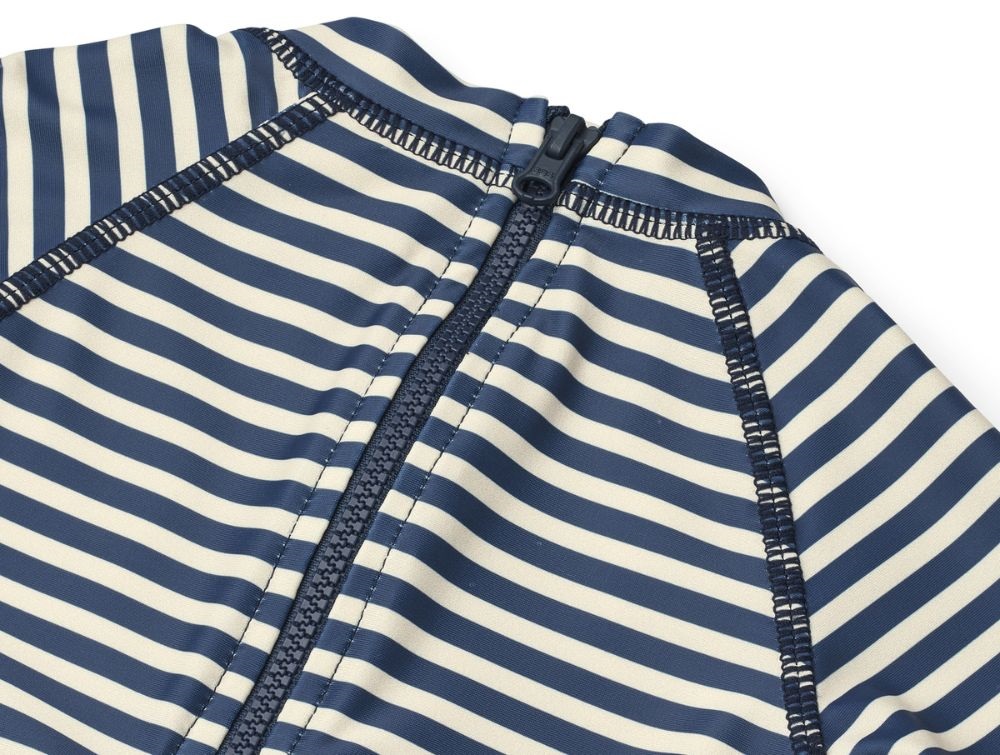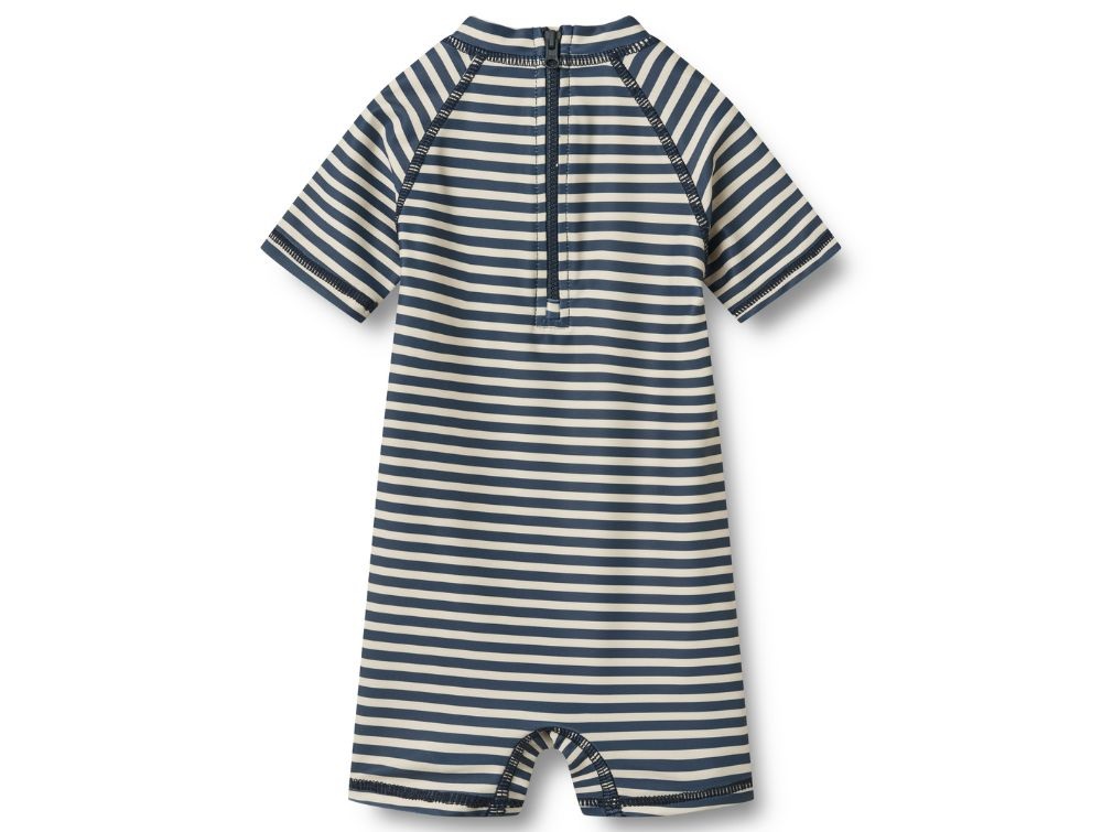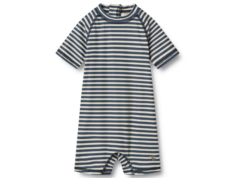 Klassisk badedragt fra Wheat med striber (blue stripe) i en tidløs kombination af råhvid og mørkeblå. Modellen har korte ærmer og ben samt en lille krave, der beskytter nakken mod solen.