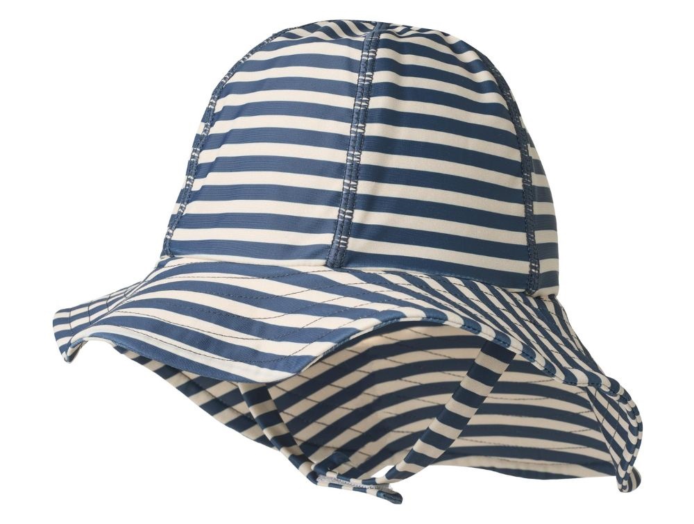 Klassisk solhat fra Wheat med et tidløst stribet design i råhvid og mørkeblå. Hatten har en bred skygge med synlige syninger og er længere i nakken for ekstra solbeskyttelse.