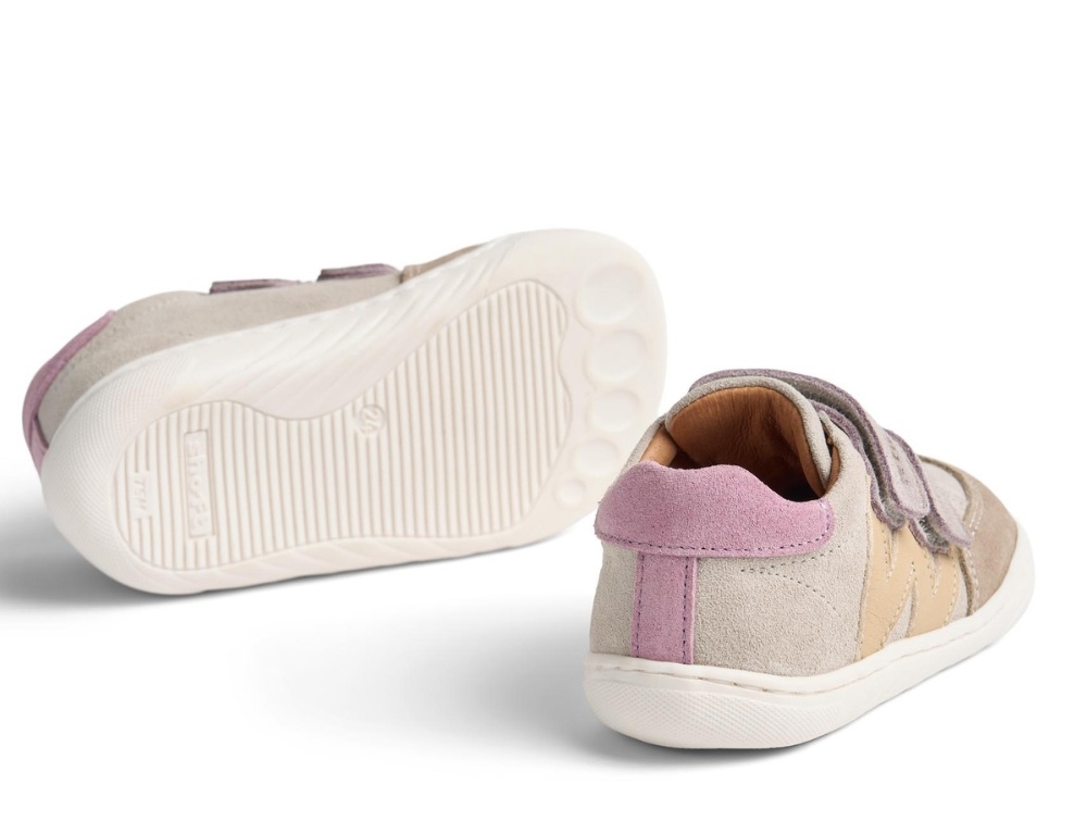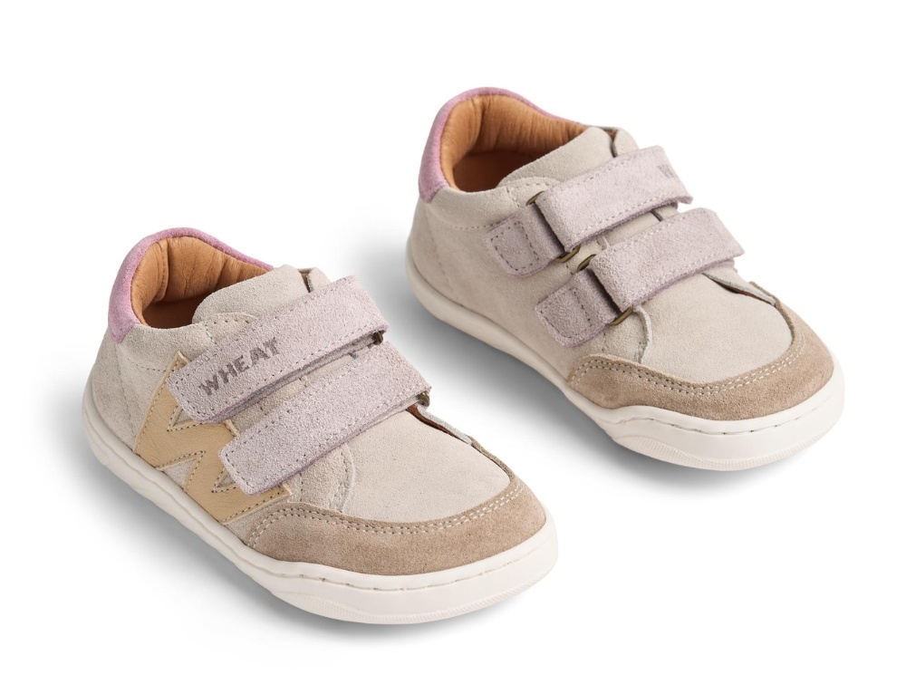 Sneaker i råhvid nuance fra Wheat med lilla detaljer. Modellen Barres er en fleksibel og let barfodssko i ruskind og læder med dobbelte velcroremme, der gør den nem at justere til barnets fod.