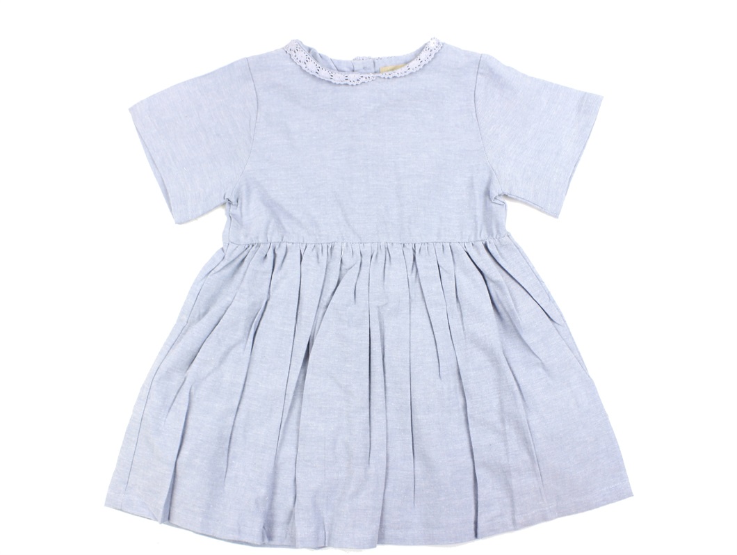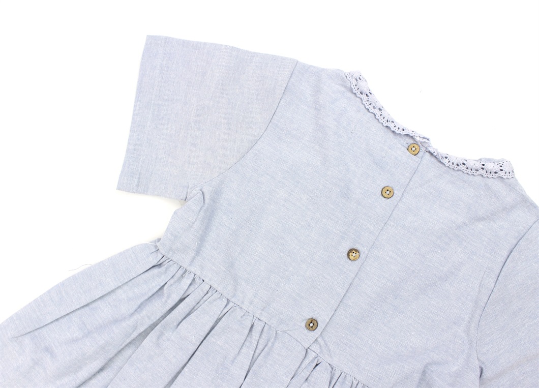 Kortærmet kjole i farven blue waves med knapper i ryggen og blondedetalje i halsåbning fra Wheat.