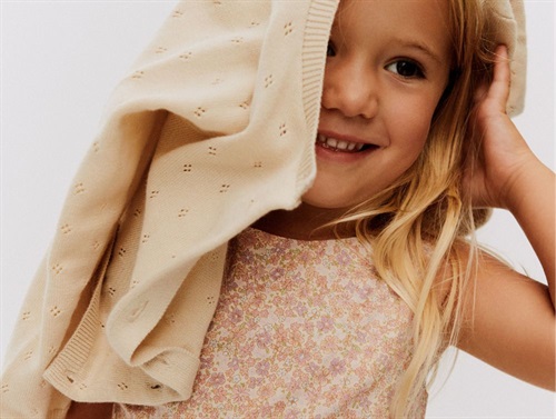 Blød langærmet bomuldscardigan fra Wheat i en lys varm sandfarve. Den har et fint hulmønster og en let A-formet silhuet, der giver et klassisk og tidløst udtryk.