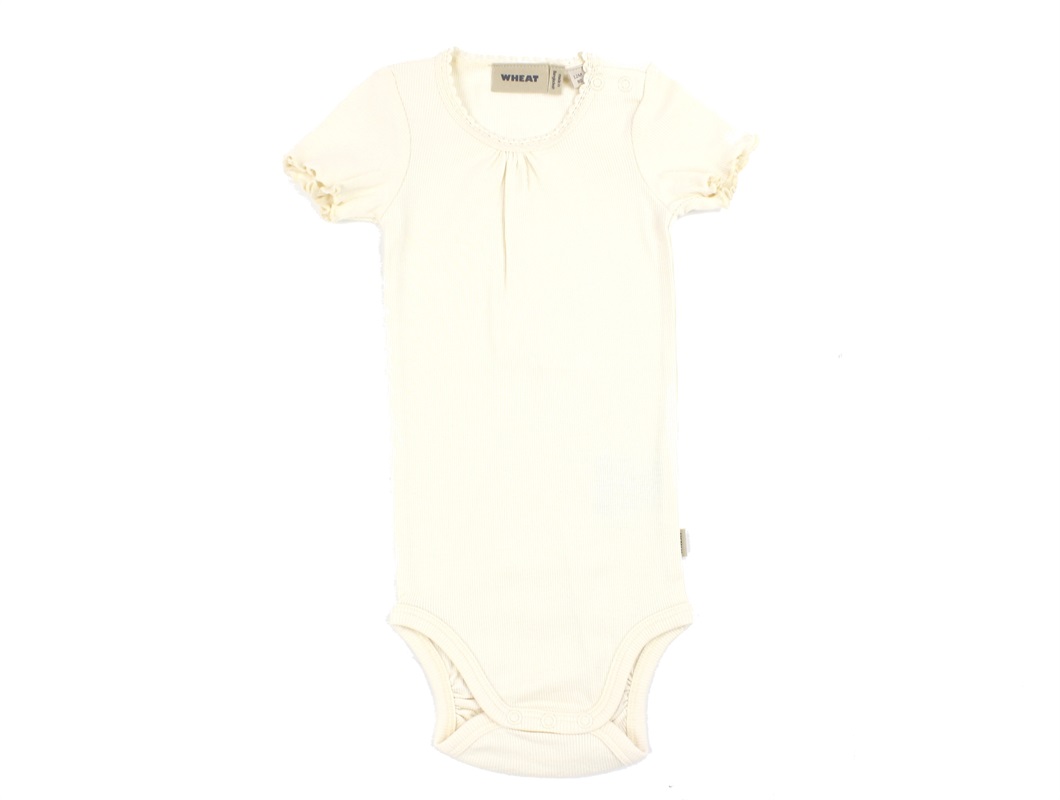 Kortærmet bodystocking i rib i farven cream med blondekant i halsåbning fra Wheat.