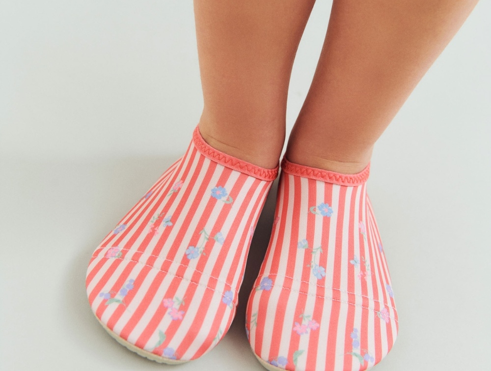 Badesko i rødstribet design fra Wheat. Dolphin er en let og fleksibel badesko, der beskytter små fødder på stranden, ved poolen og under leg i vand.
