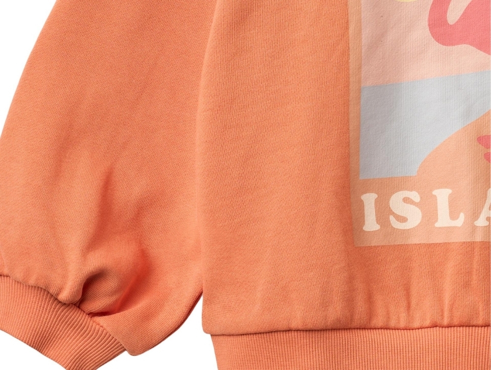 Sweatshirten er fremstillet i 100% økologisk bomuld og har en afslappet pasform med sænkede skuldre. Ribkanter ved hals, ærmer og bund giver et klassisk sweatshirt-look, mens det sommerlige print tilføjer et friskt udtryk. Perfekt til både hverdag og leg.