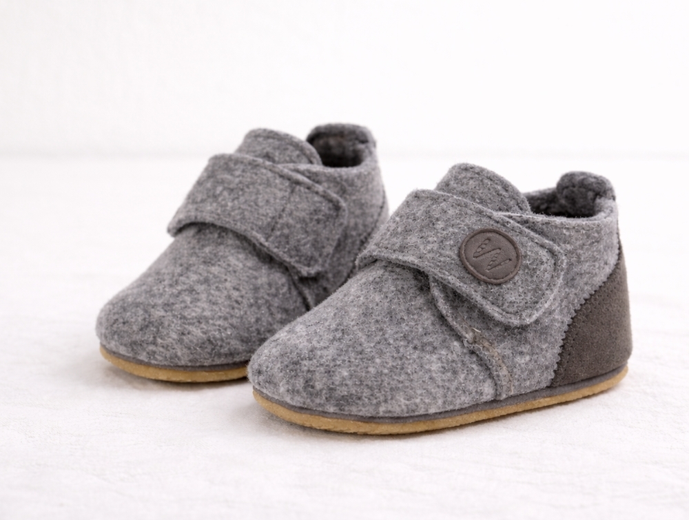 Grå uldfilthjemmesko fra Wheat. Hjemmeskoene lukkes nemt med velcrorem.