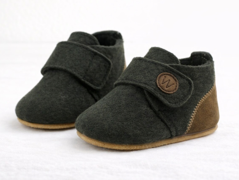 Uldfilthjemmesko i farven olive fra Wheat. Hjemmeskoene lukkes nemt med velcrorem.
