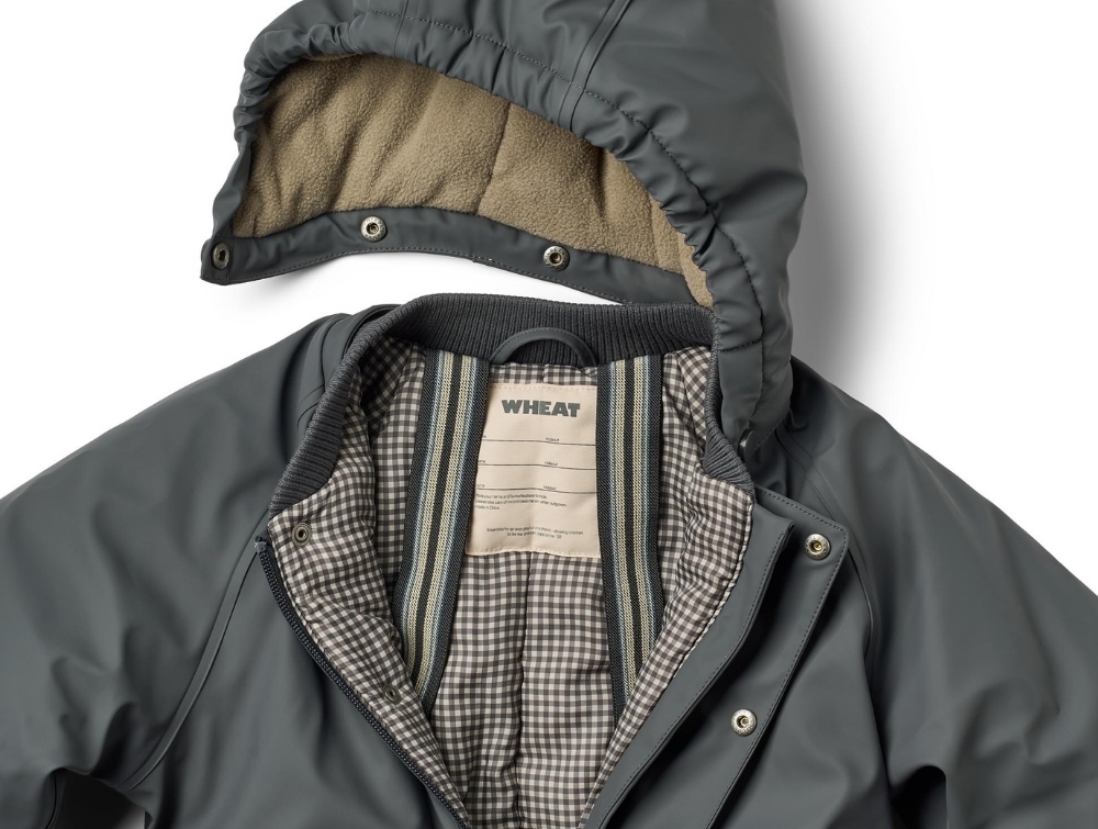 Mere information om Wheat Ludo gummiflyverdragt gråblå med justerbar hætte