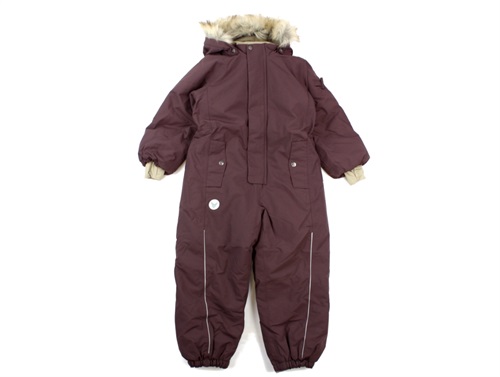 Flyverdragt i farven eggplant fra Wheat. Flyverdragten har en aftagelig hætte med trykknapper og syntetisk pels, som kan tages af med knapper.