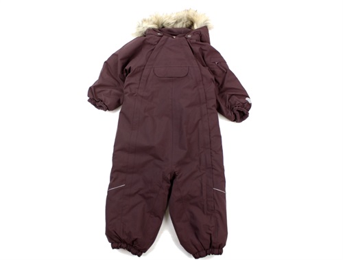 Flyverdragt i farven eggplant fra Wheat. Flyverdragten har en aftagelig hætte med trykknapper og syntetisk pels, som kan tages af med knapper.