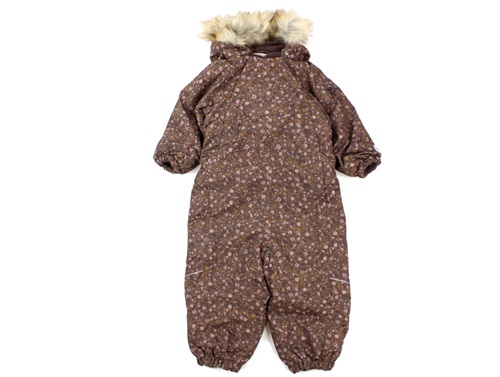 Flyverdragt i farven eggplant flowers med blomsterprint fra Wheat. Flyverdragten har en aftagelig hætte med trykknapper og syntetisk pels, som kan tages af med knapper.
