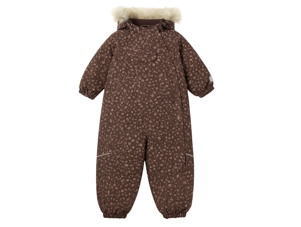 Flyverdragt i farven cone and flowers med blomsterprint fra Wheat. Flyverdragten har en aftagelig hætte med trykknapper og syntetisk pels, som kan tages af med knapper.